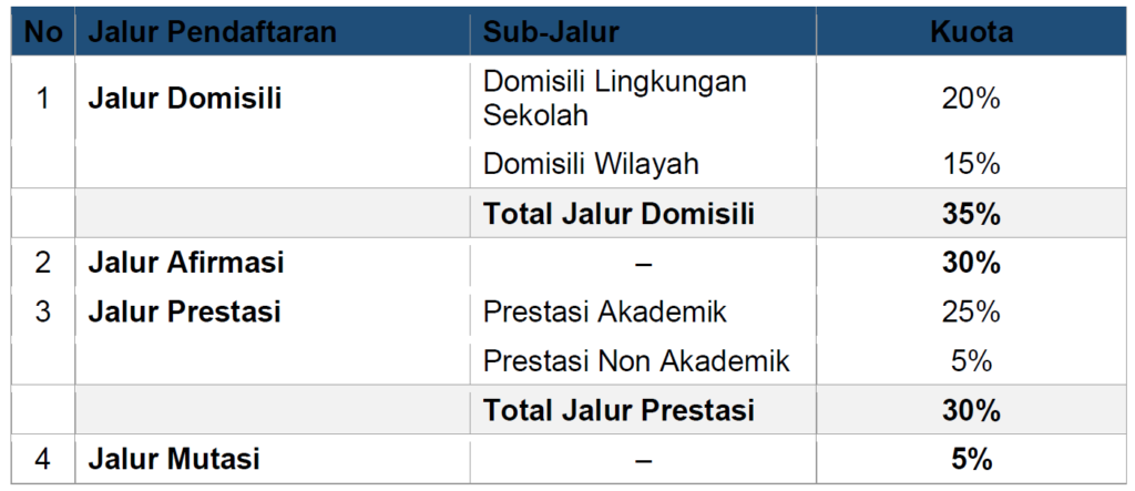 - Jalur Domisili Lingkungan Sekolah: diperuntukkan bagi calon murid yang berdomisili di wilayah lingkungan sekolah paling jauh 1.000 meter;